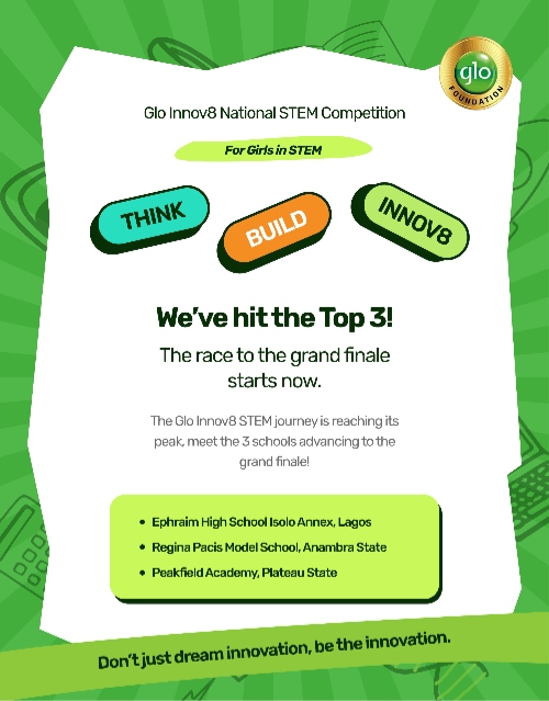 The curtains are gradually falling on Globacom’s “Glo Innov8” National STEM competition for girls in senior secondary schools across the country, as three top finalists have emerged for the grand finale slated for the Mike Adenuga Centre (Alliance Française), Ikoyi, Lagos.