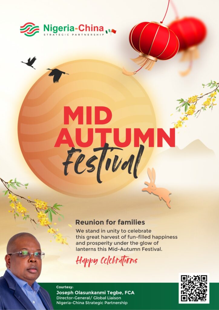 The Director General of the Nigeria-China Strategic Partnership (NCSP), Mr. Joseph Olasunkanmi Tegbe, has extended heartfelt congratulations to the government and people of China as they celebrate the 2025 Mid-Autumn Festival—a season of joy, reunion, and reflection.
