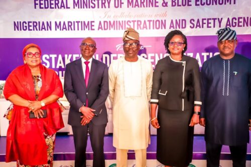 R-L – Director, Maritime Boundary Commission, Mr. Nurudeen Abba, Director, Maritime Safety and Security, Federal Ministry of Marine and Blue Economy (FMM&BM), Mr. Babatunde Bombata; Permanent Secretary, Federal Ministry of Solid Minerals/Steel Development, Mrs. Mary Ogbe; Permanent Secretary, FMM&BM, Mr, Oloruntola Olufemi; Director General, NIMASA, Dr. Dayo Mobereola; and former Permanent Representative of Nigeria to the International Seabed Authority, Dr. Maureen P. Tamuno. At the Stakeholders’ Sensitization Workshop on Deep Seabed Activities in Nigeria, held in Abuja … Wednesday.