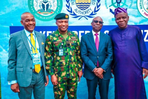 R-L – Executive Director Operations, Nigerian Maritime Administration and Safety Agency (NIMASA), Engr. Fatai Taiye Adeyemi, Director General, NIMASA, Dr Dayo Mobereola, Director of Manning, Naval HQ, Rear Admiral Sunday Atakpa, and the Director, Marine Environment Management, NIMASA, Mr. Heaky Dimowo, at the Stakeholders’ Sensitization Workshop on Deep Seabed Activities in Nigeria, held in Abuja Wednesday